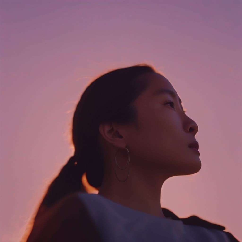 This image shows a woman standing, captured in a cinematic style. The shot features dramatic shadows, golden hour lighting, a soft-focus background, and a shallow depth of field.