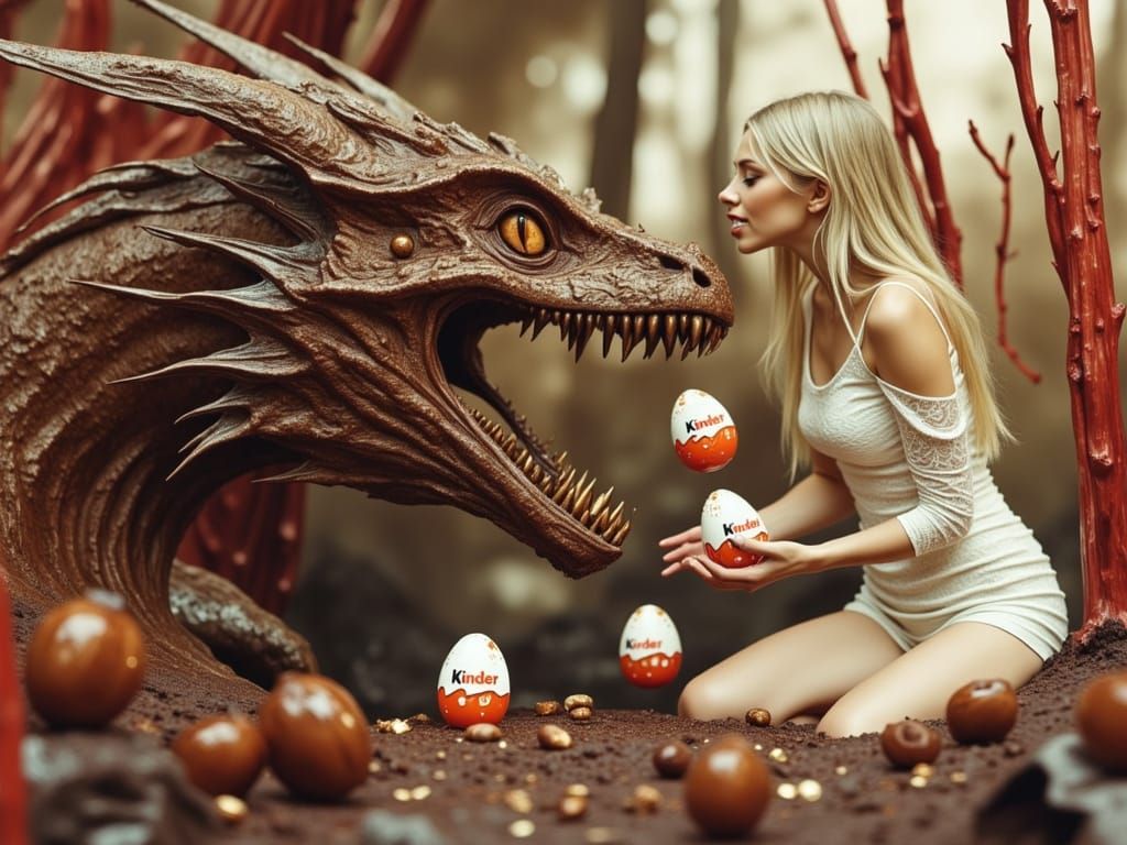A photorealistic image shows a milk chocolate dragon eating chocolate next to a white chocolate cyborg in an alien forest with chocolate and licorice. The image has magical lighting and sugar particle textures.