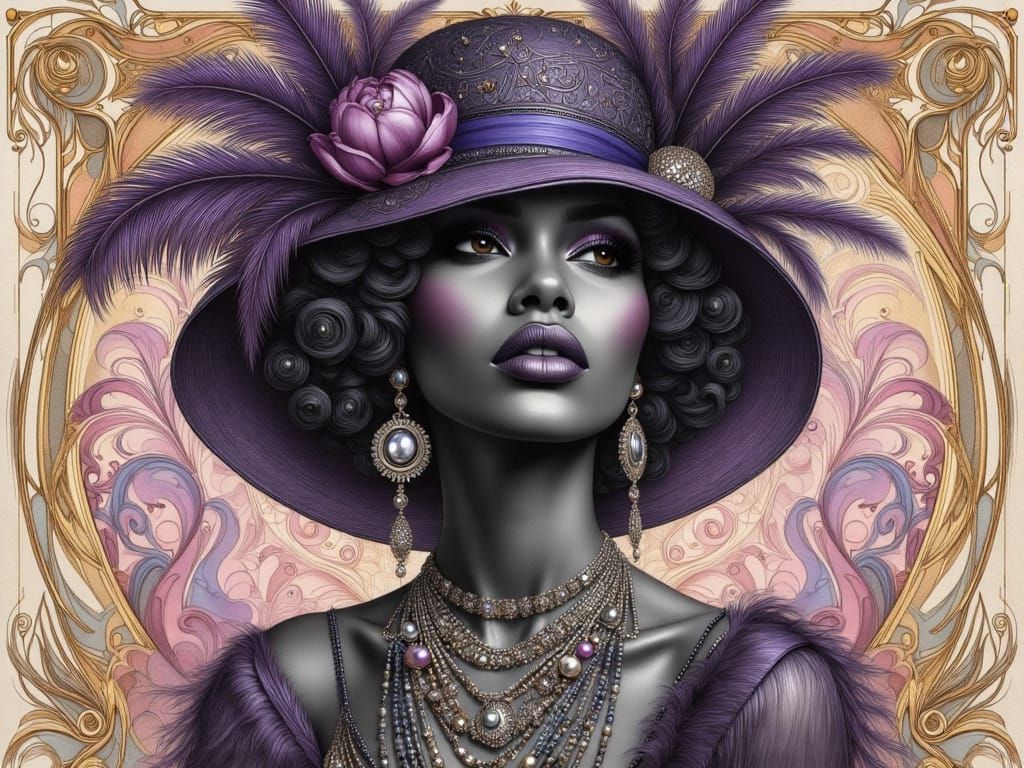 This image showcases a detailed charcoal drawing of a fashionable Black woman in a feathered flapper hat, rendered in shades of purple and blue with an Art Nouveau background.