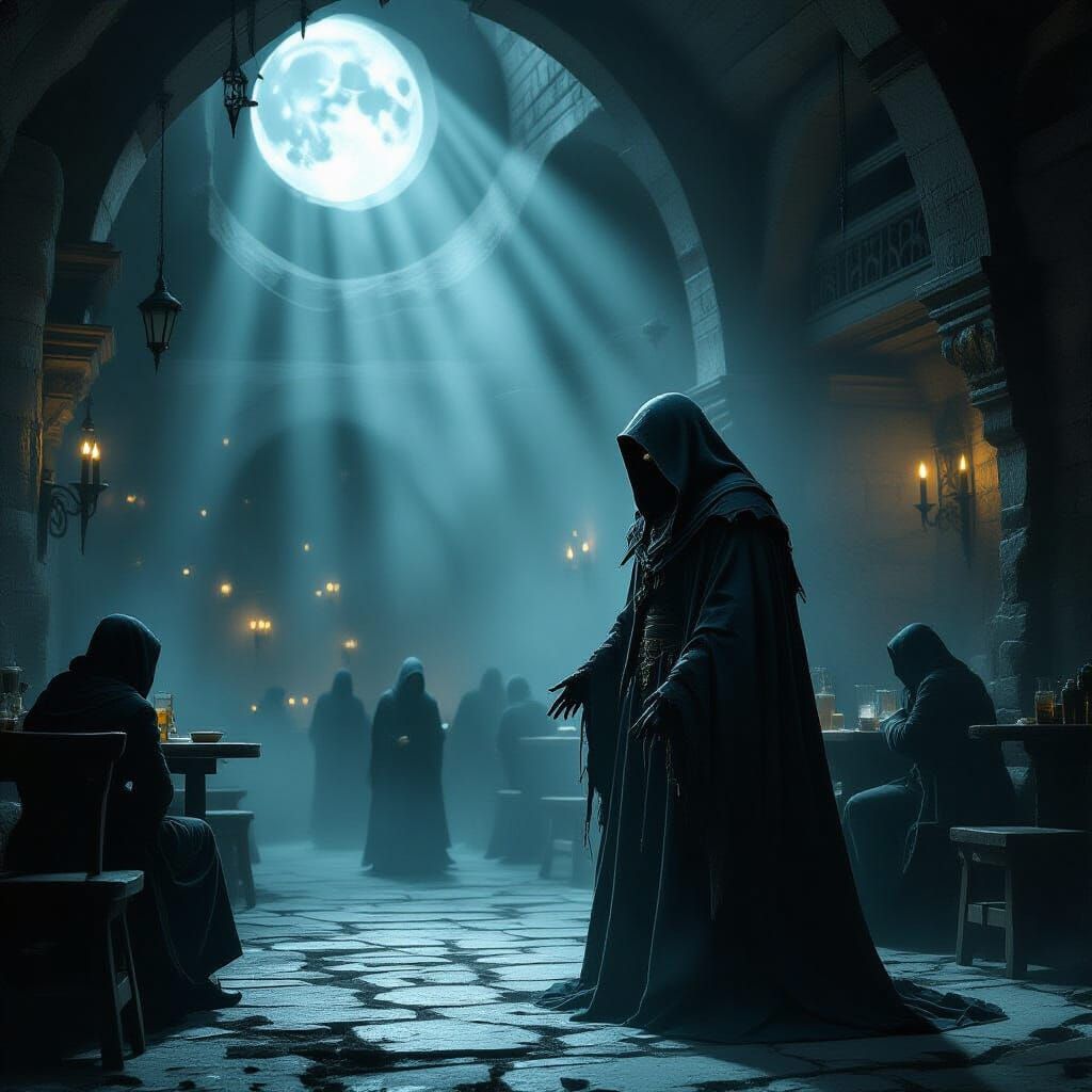 A solitary cloaked figure stands in a shadowy, cavernous tavern. Dust motes dance in moonlight, with indistinct patrons present, rendered with stark lighting and gothic horror elements.