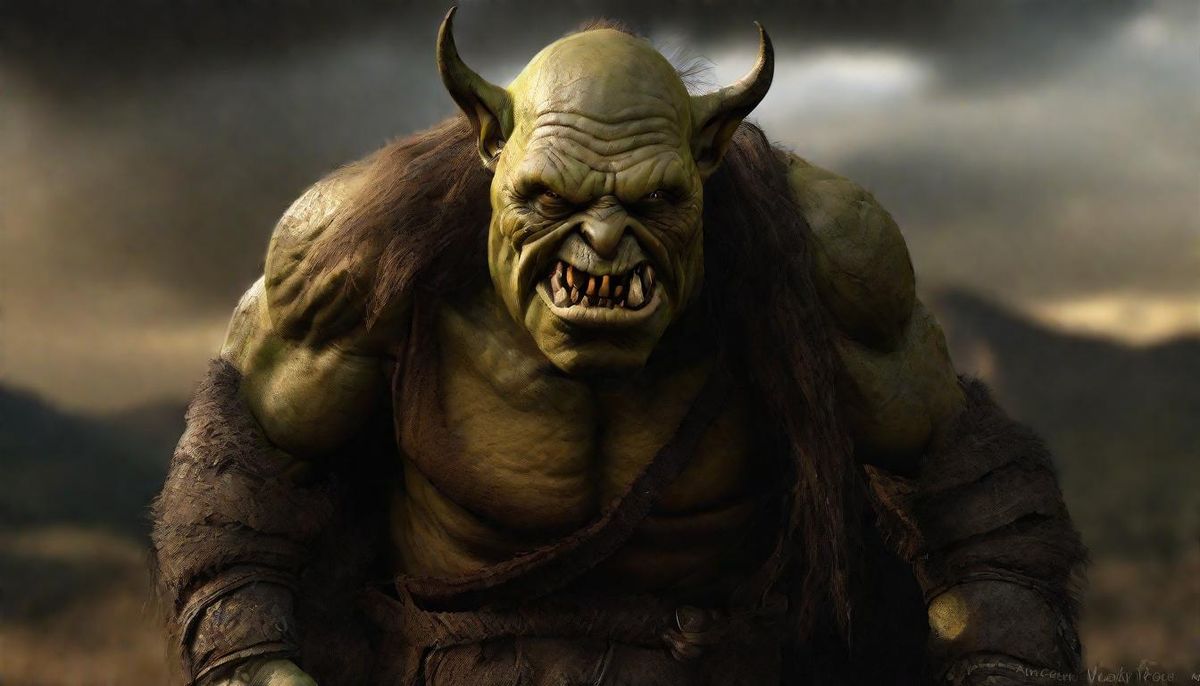 Full body Portrait of an ugly deformed (orc from LOTR novel:1.4) by Tolkien on the Battlefield. Ugly, evil looking, squat, broad, flat-nosed, brownish-skinned, with_wide_mouth and slant eyes, yellow_teeth, 8k resolution. High_contrast. Intricate_details. Elaborate_background. Perfect_composition. Colorful. ...