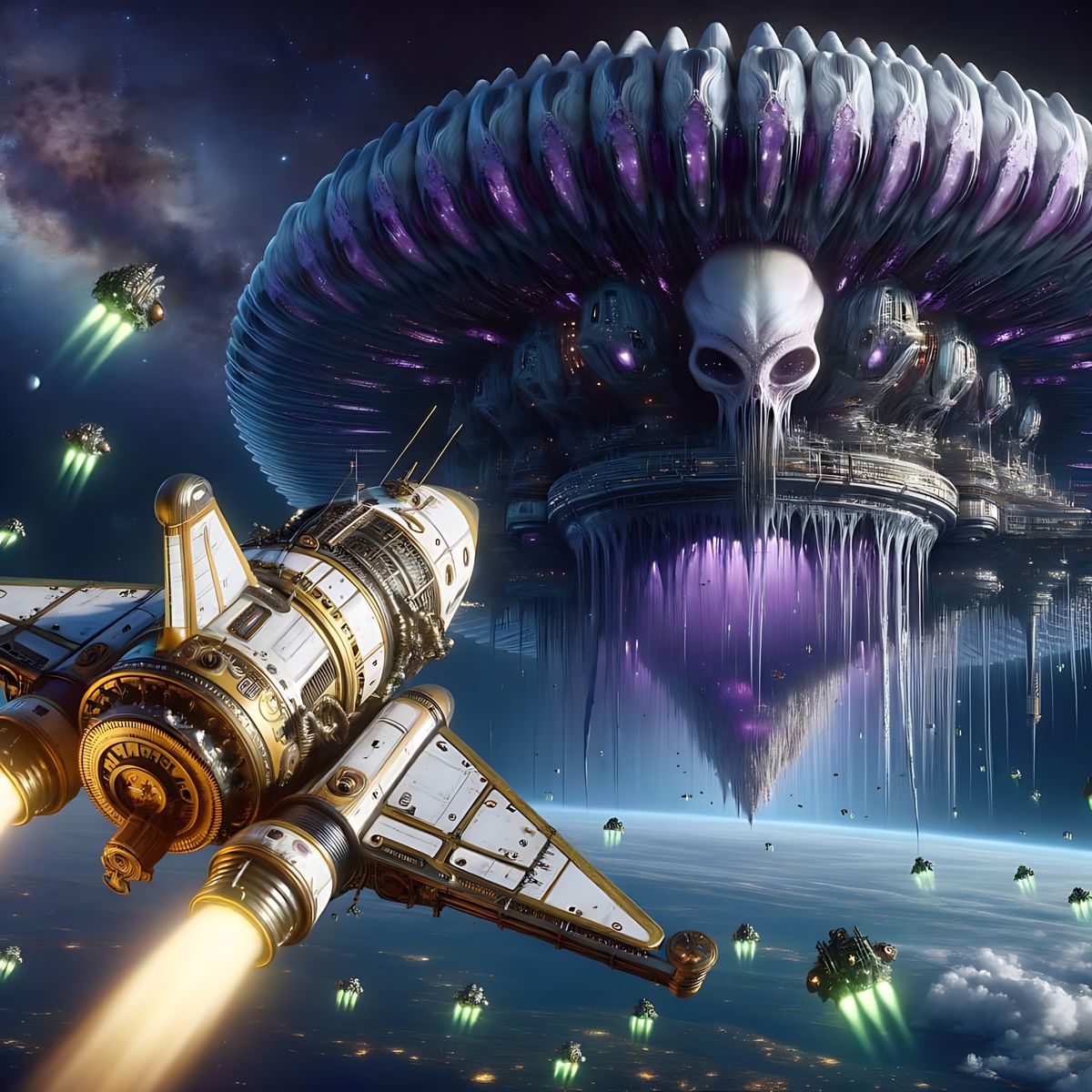 This image shows a steampunk rocket ship flying towards a giant alien mothership in another dimension. The scene features purple and black colors, crystalline structures, and small green drones.