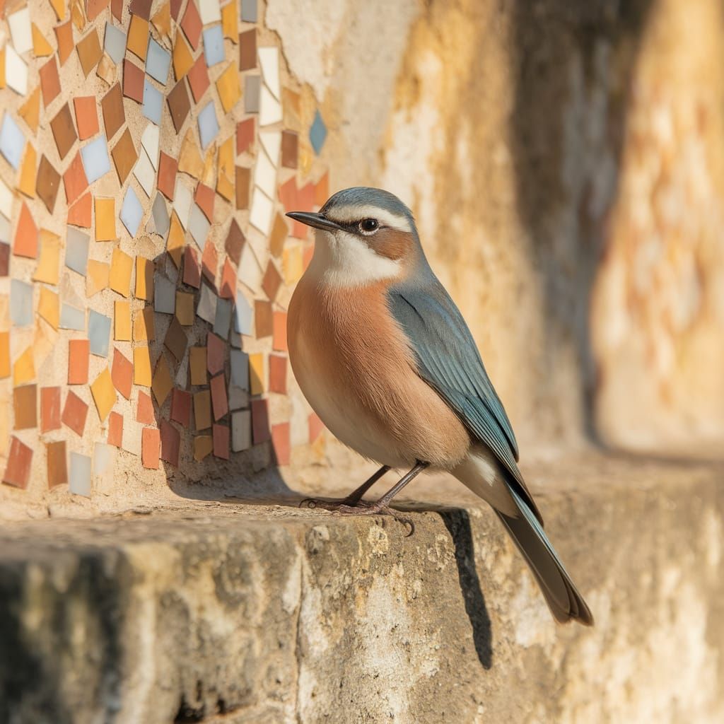 A beautiful image of a Whinchat perched on a stone wall with a vibrant mosaic backdrop, showcasing the bird's plumage against warm earth tones and soft golden sunlight.