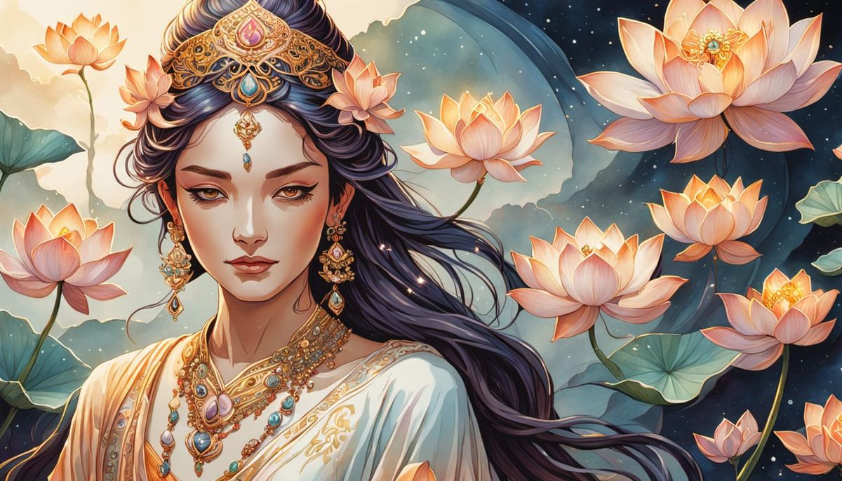 This image shows a serene goddess wearing blooming lotus flowers, intricate jewelry, and flowing silk robes in a dreamy watercolor style with soft focus and warm golden light.