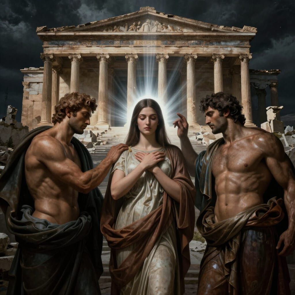 michelangelo paintings style and colours : rhodes colossus guys around with central beautiful armenian woman with ultra straight hair, shy, very connected spiritual, Erechtheion in background with ruins, third eye chakra,, ray of lights between characters, ultra deep contrast, large scene composition, ...