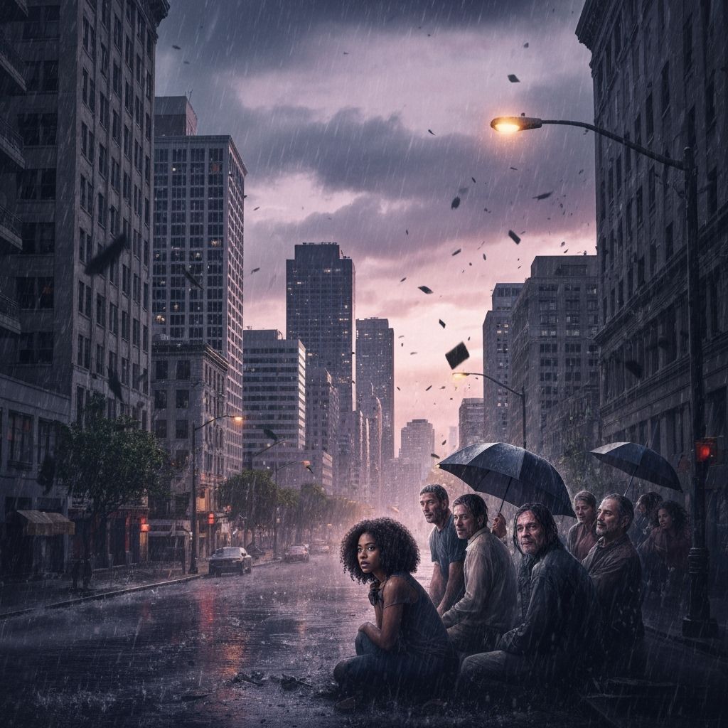 A vivid depiction of a hurricane's fury over a coastal city at dusk. Rain-soaked figures battle fierce winds under dark clouds, lightning, and torrential rain, in a dramatic, painterly style.