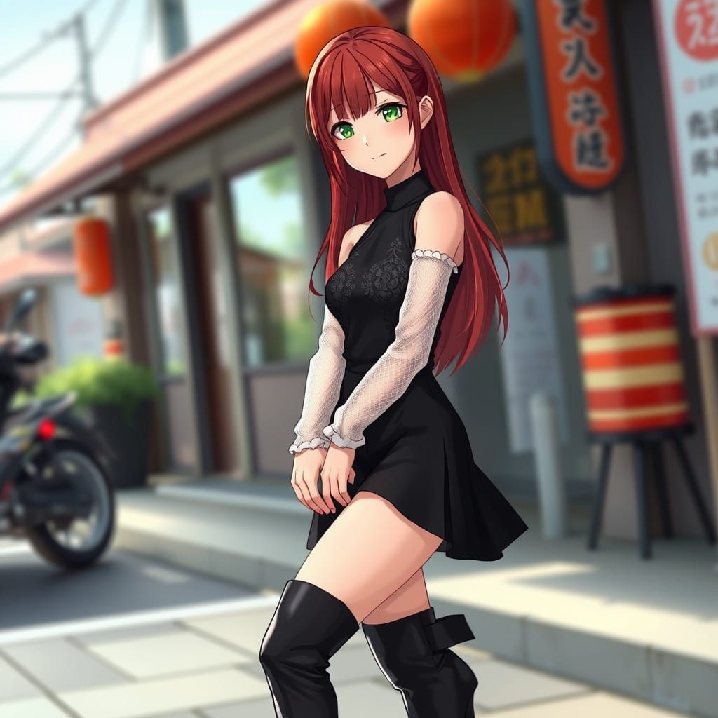 This image shows a petite Japanese woman with red hair in a black mini dress, mesh bodysuit, and platform boots. The hyperrealistic style blends anime and manga aesthetics with vibrant colors and intricate details.