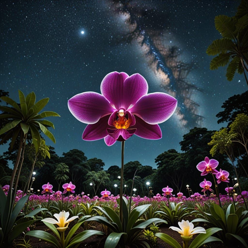 A surreal image of a giant orchid blooming in a magical garden beneath a vast, starry night sky with a UFO hovering above.
