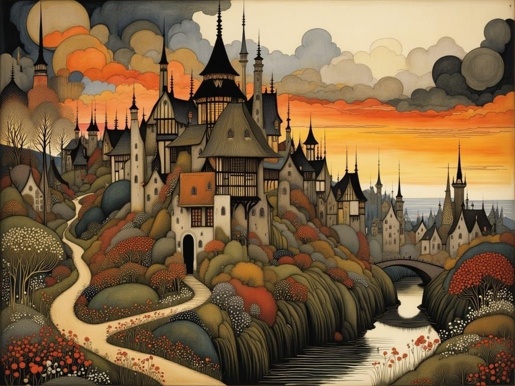 This image depicts a highly detailed medieval town with entangled elements, rendered in deep, luminous colors, evoking a mysterious atmosphere.