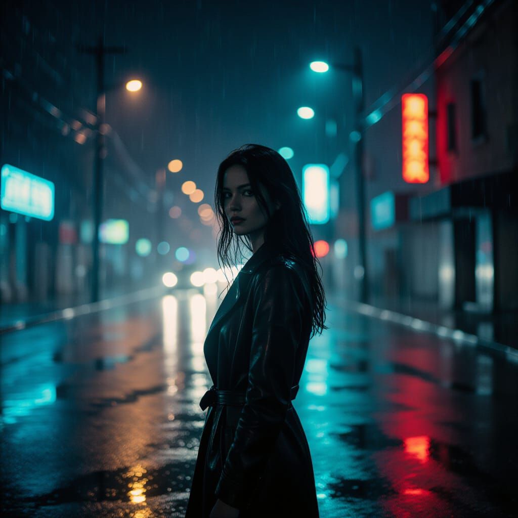 This image shows a solitary woman in the rain at midnight, bathed in cinematic lighting. The image has a film-like quality with grain and vignette, enhanced by careful color grading. It evokes a cinematic aesthetic.