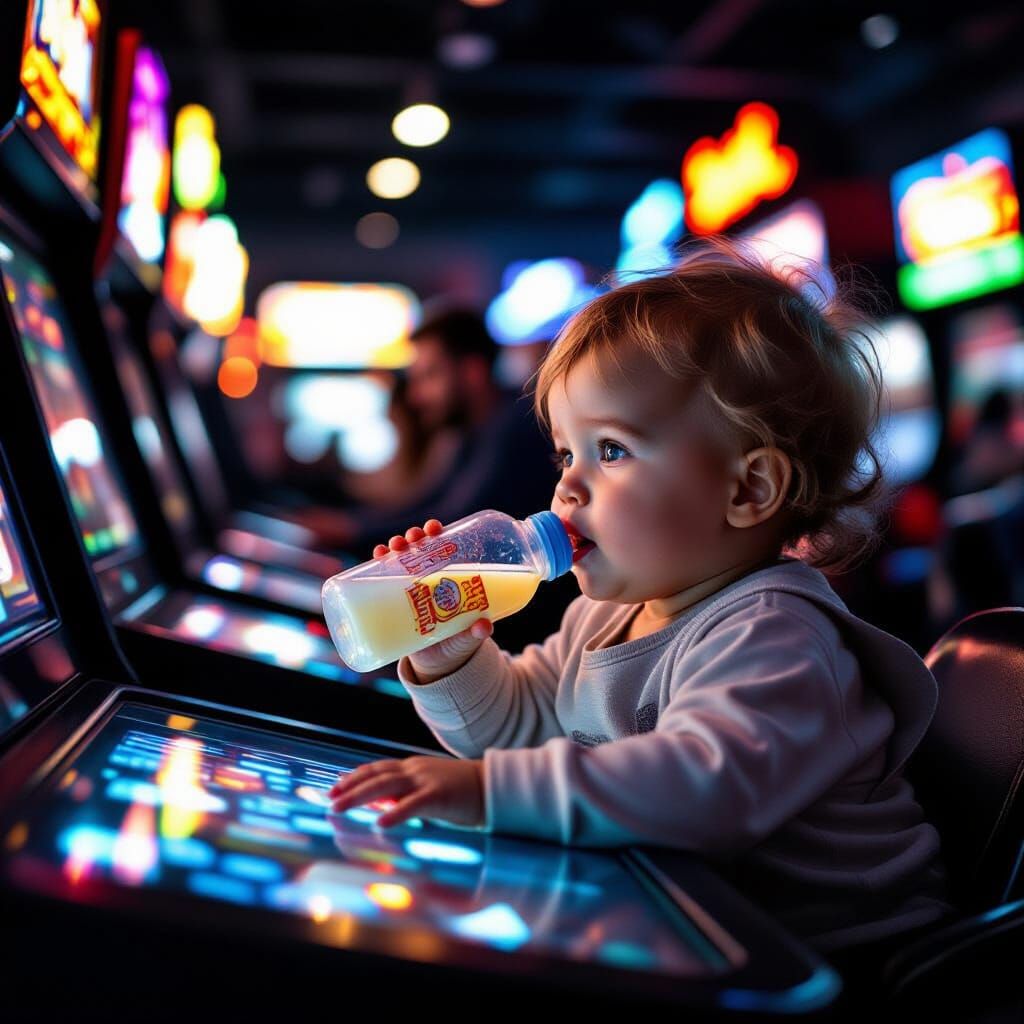 This image captures a baby engrossed in arcade games while holding a bottle, illuminated by striking, dramatic lighting.