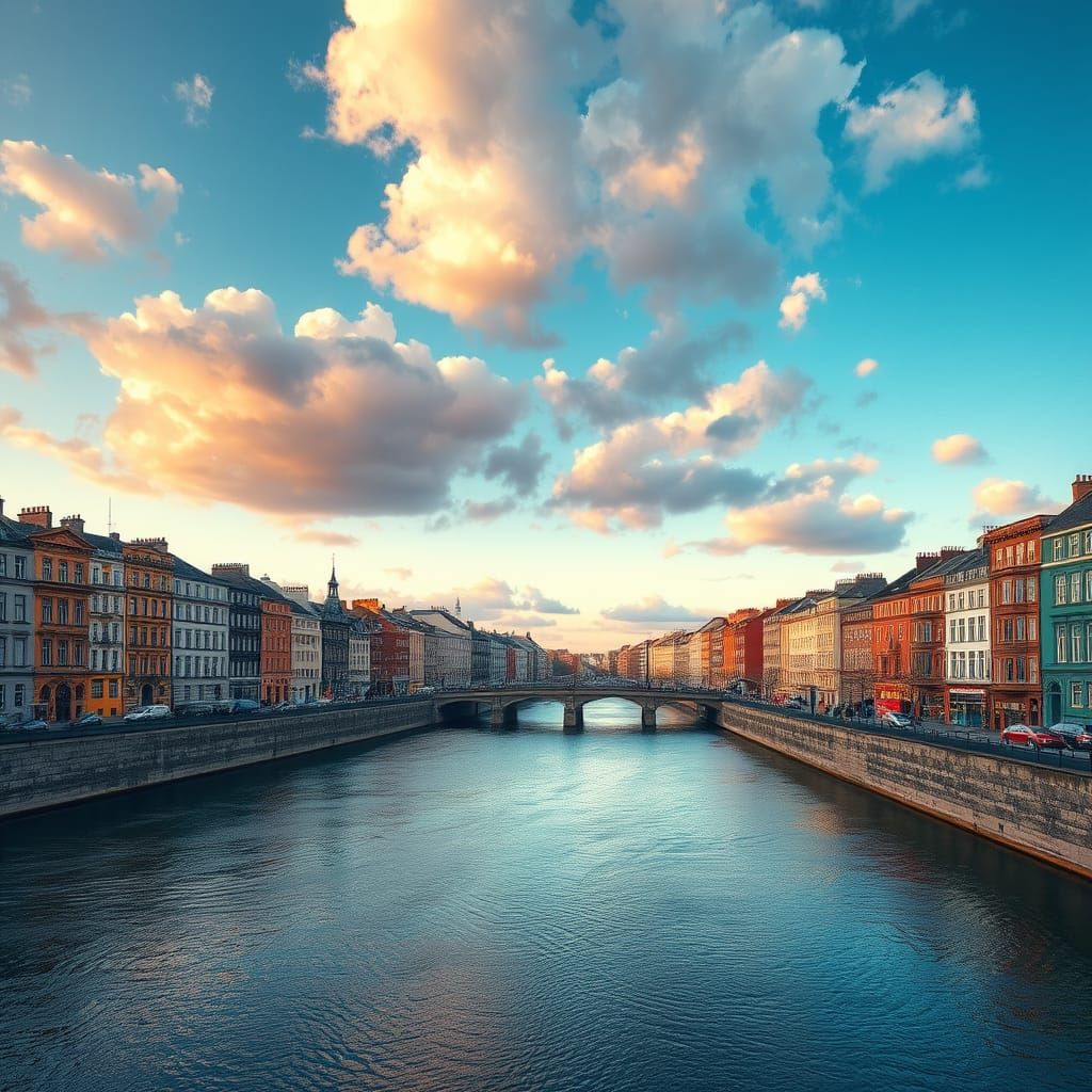 A breathtaking, photorealistic image of a summer sky over Dublin City Centre, with detailed clouds and vibrant, bold hues, reminiscent of a fantastical fairy tale scene