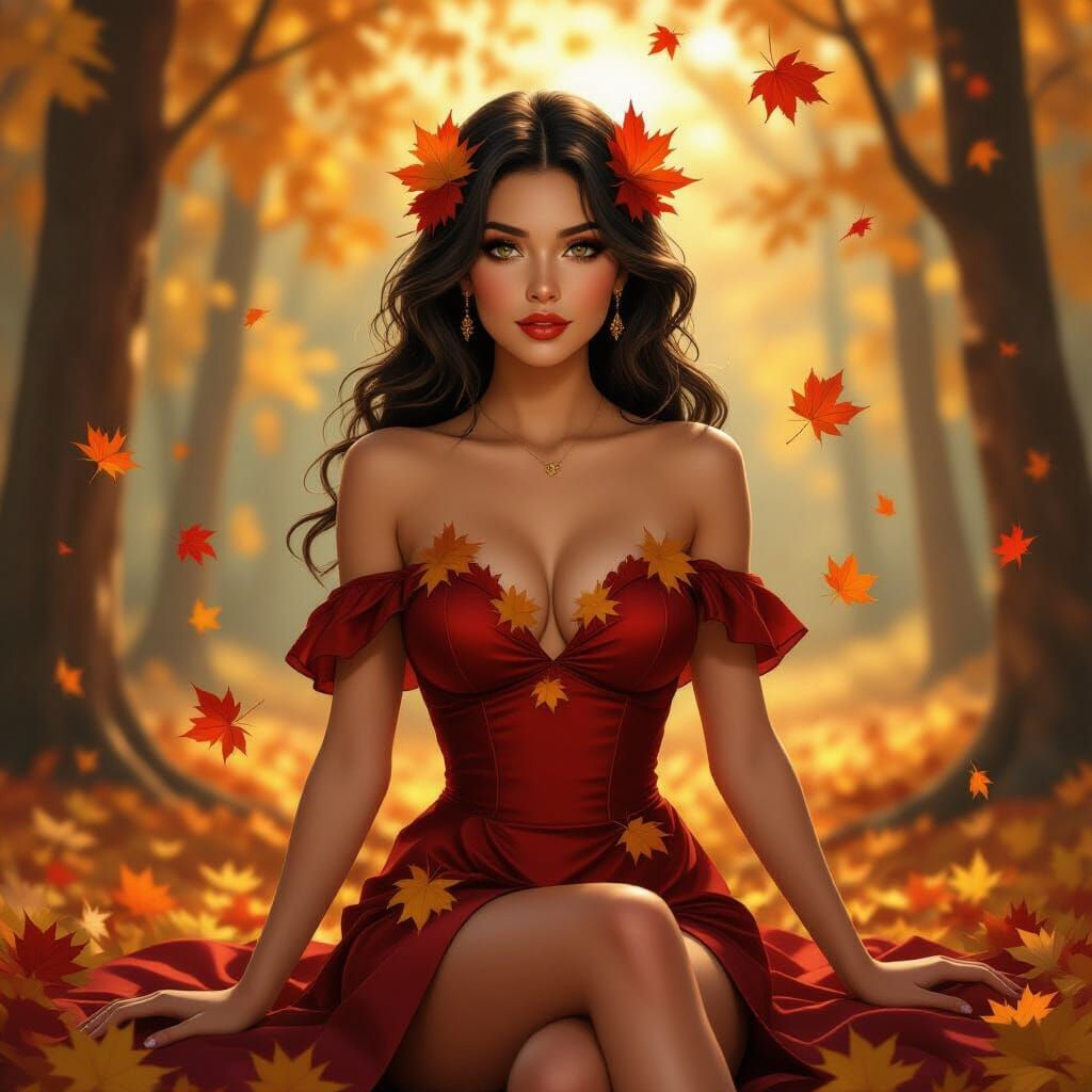 A pin-up lady in an autumnal forest clearing bathed in golden light, adorned with falling leaves. Rendered in a detailed matte painting style with deep, complementary colors.