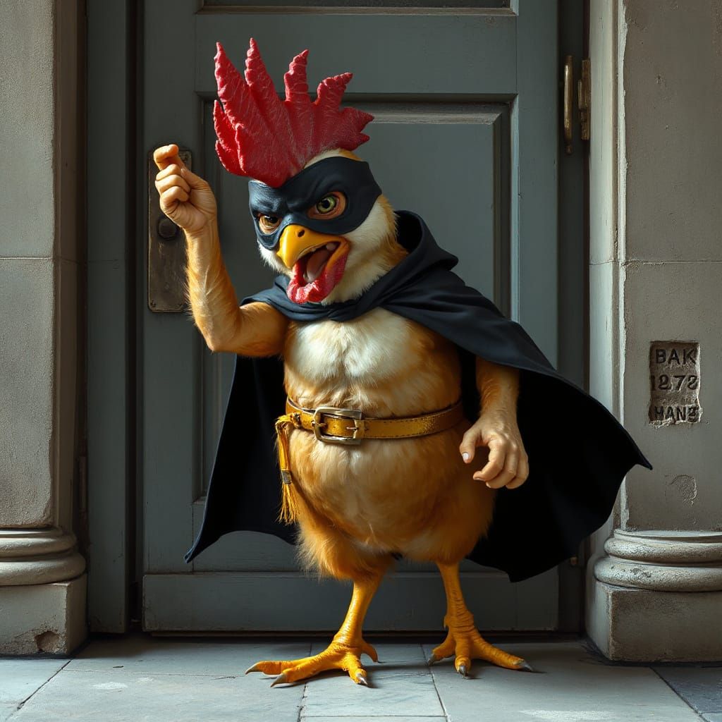 This image shows an irate chicken wearing a black mask and cape, attempting to rob a bank. The chicken is comically dressed as a cartoon villain.