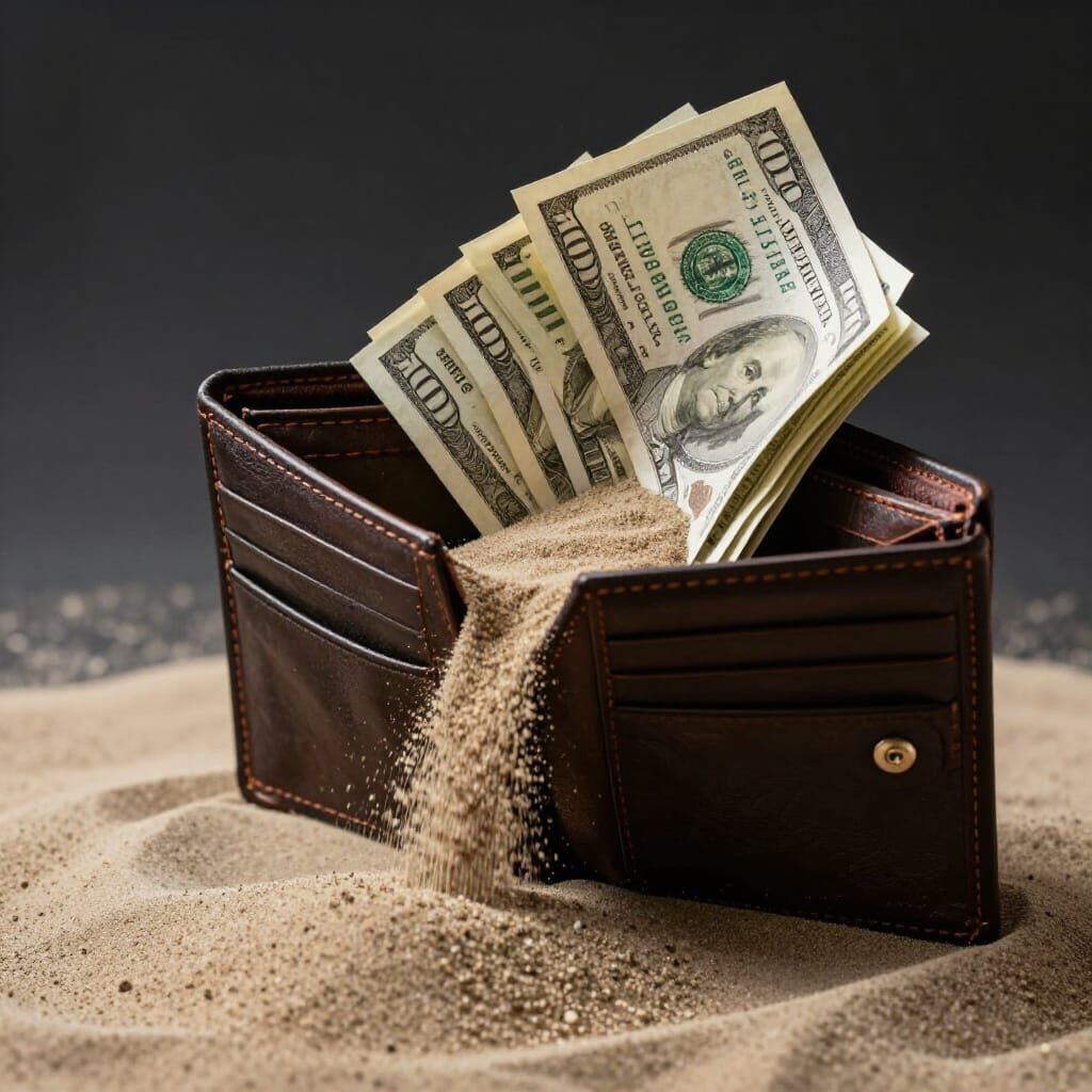 This image shows an open leather wallet spilling sand instead of money, with dramatic lighting and high detail textures, evoking a theme of economic downturn.