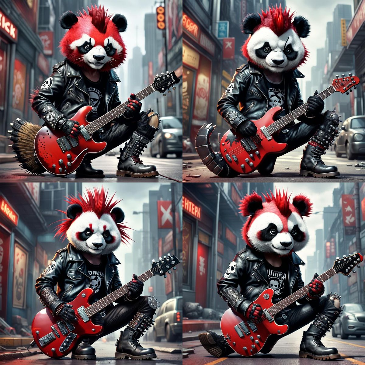 This image shows a panda in punk rock attire, including a leather jacket, boots, and red mohawk. The panda is playing an electric guitar in a hyperrealistic style.