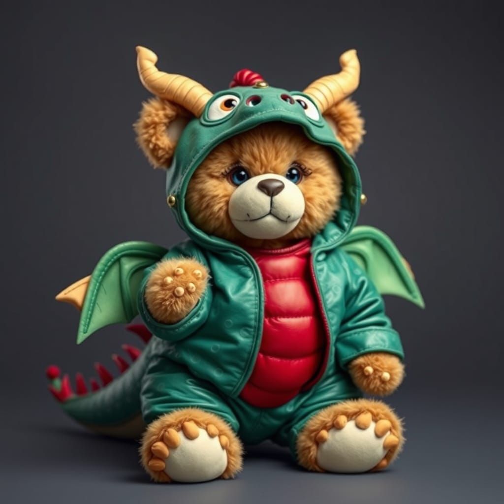A whimsical illustration of a cuddly teddy bear wearing a fantastical dragon suit, blending playfulness and mythical adventure.