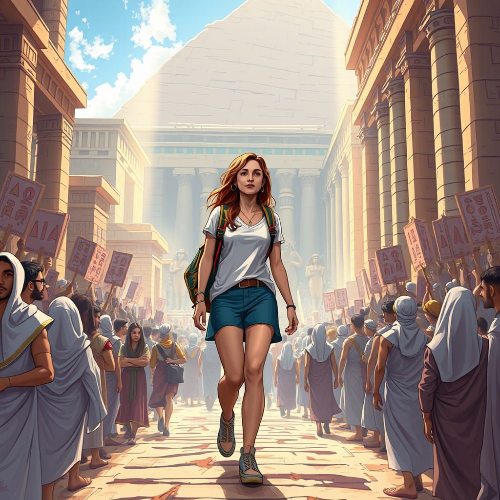This image shows a modern student stepping through a portal into ancient Egypt. The busy streets are filled with people in linen robes, with detailed hieroglyphics and monumental architecture, in a vibrant digital painting style.