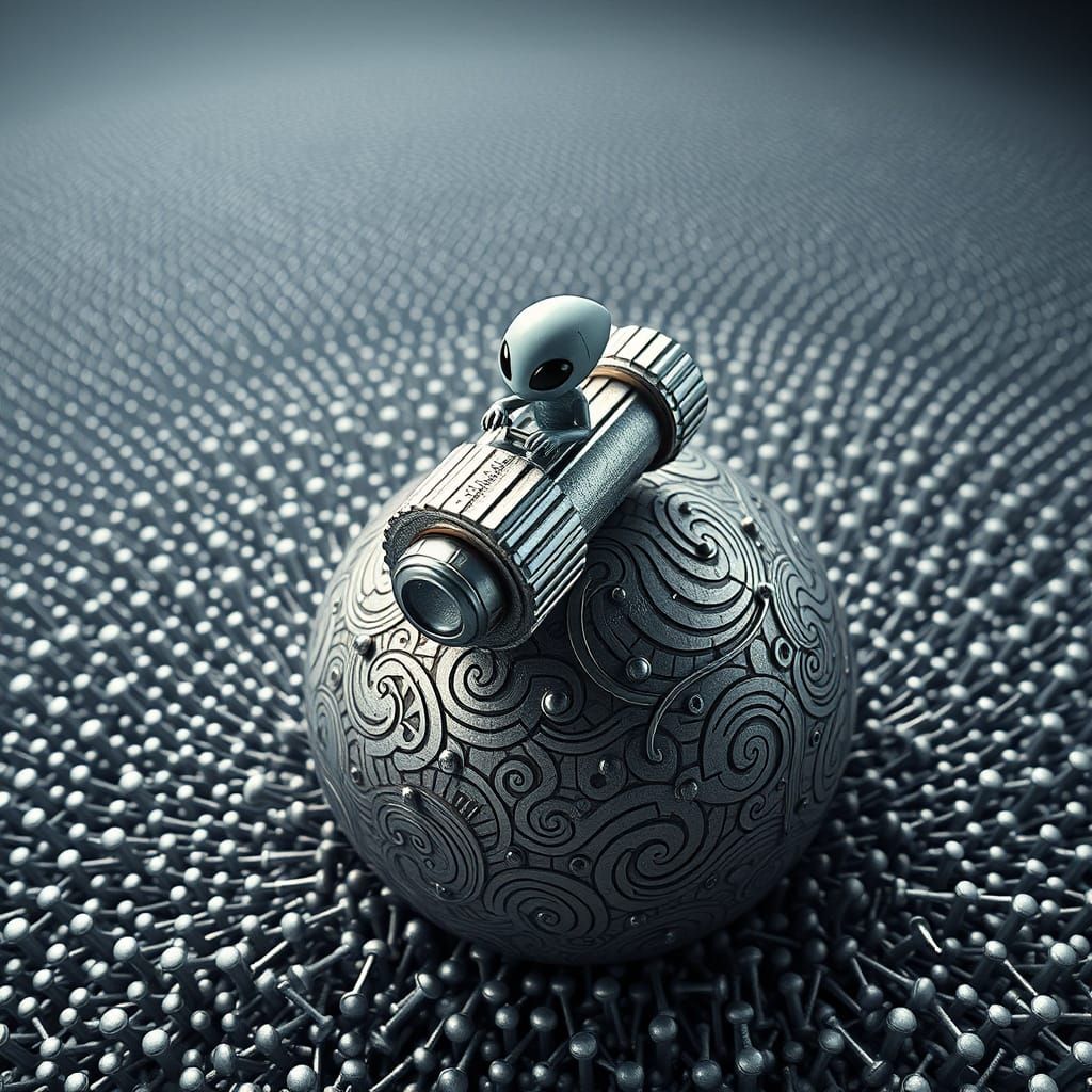 This image shows a futuristic, 3D-rendered alien in a miniature vessel soaring above a metallic planet with intricate, Escher-inspired patterns, vector fractal details, and Zentangle-like textures, all in a vibrant, high-tech color palette