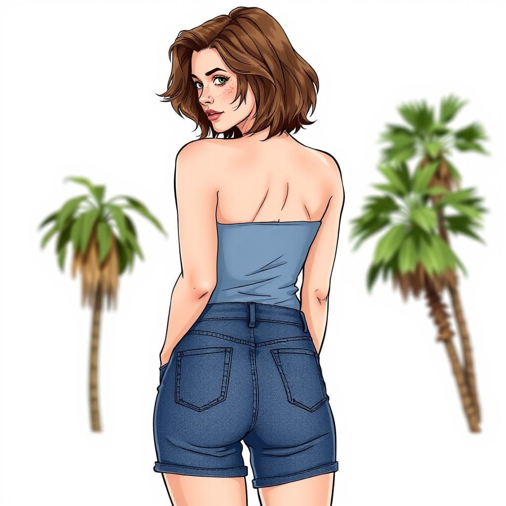 This image shows a full-body view of a 25-year-old woman with light brown hair and green eyes, depicted from behind in a graphic novel style. She is wearing a light blue tube top and denim shorts.