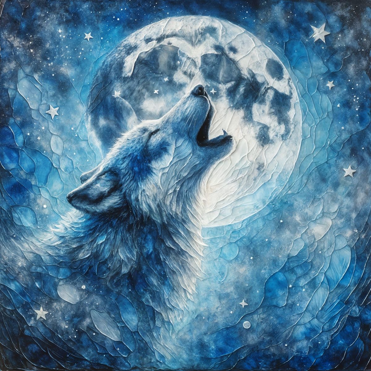 A striking picture of a lone wolf howling at the moon under a starry sky. The encaustic art style uses rich blue tones and soft textures to create a serene, ethereal ambiance.