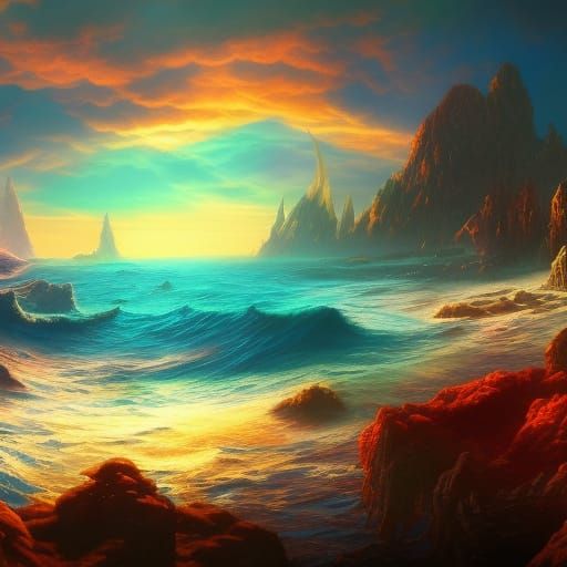 A vibrant ocean scene rendered as detailed digital art. This image showcases rich, deep colors and intricate details, reminiscent of fantasy concept art.