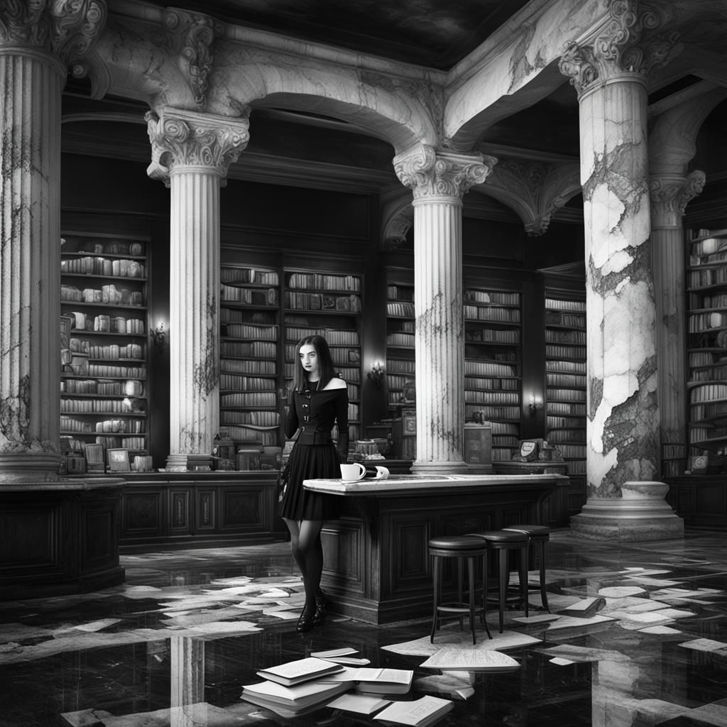 A monochrome photo of a goth model in a coffee shop. The scene includes Greek columns, decaying books, pools of water, and a black and white color palette in a digital matte painting style.