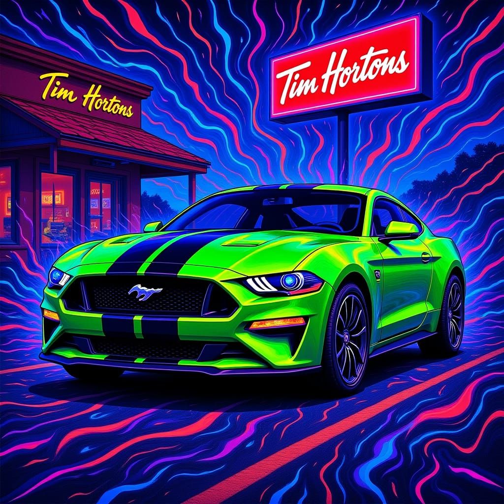 This image shows a pristine 2025 Ford Mustang in forest green with black ghost stripes parked at a Tim Hortons. It's an 8k resolution cosmic illustration in a vibrant, psychedelic style.
