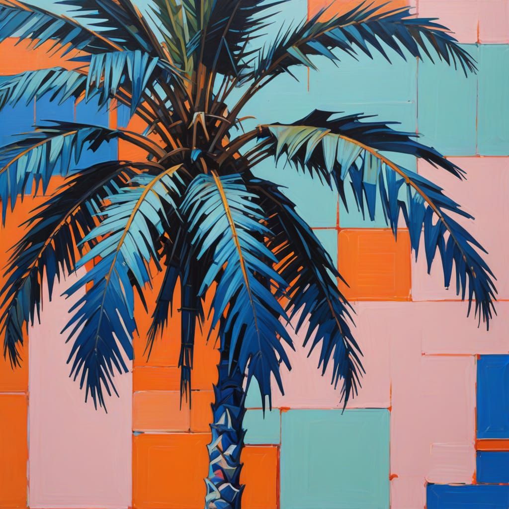 A close-up oil painting in the style of Piet Mondrian, featuring a palm tree by a blue pool with neon accents on orange fronds against a soft mint background.
