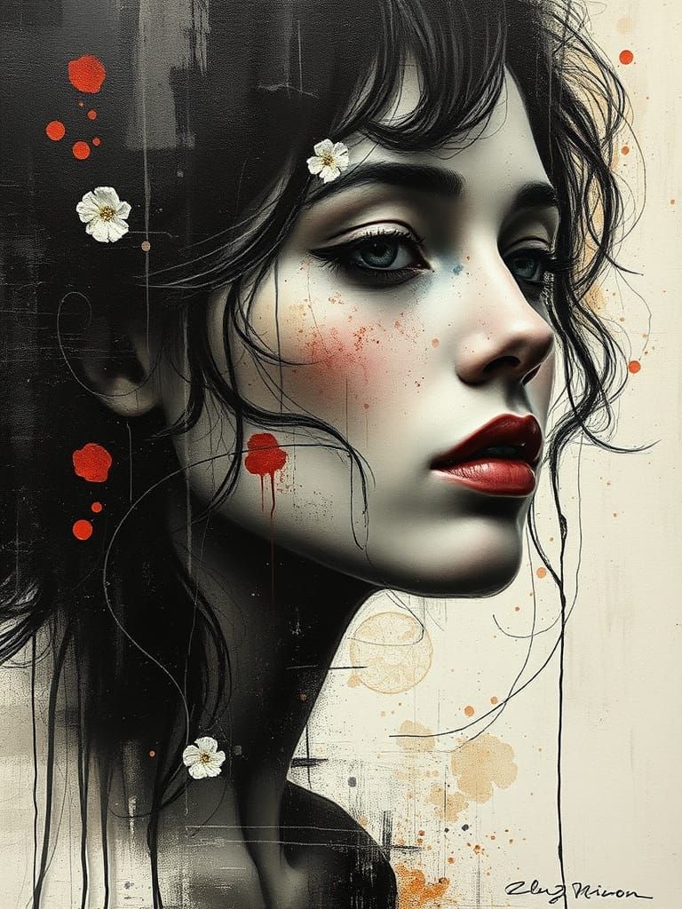 This image presents a striking portrait with a grunge aesthetic, created using layered charcoal artistry and encaustic wax pigments for a unique textured effect.