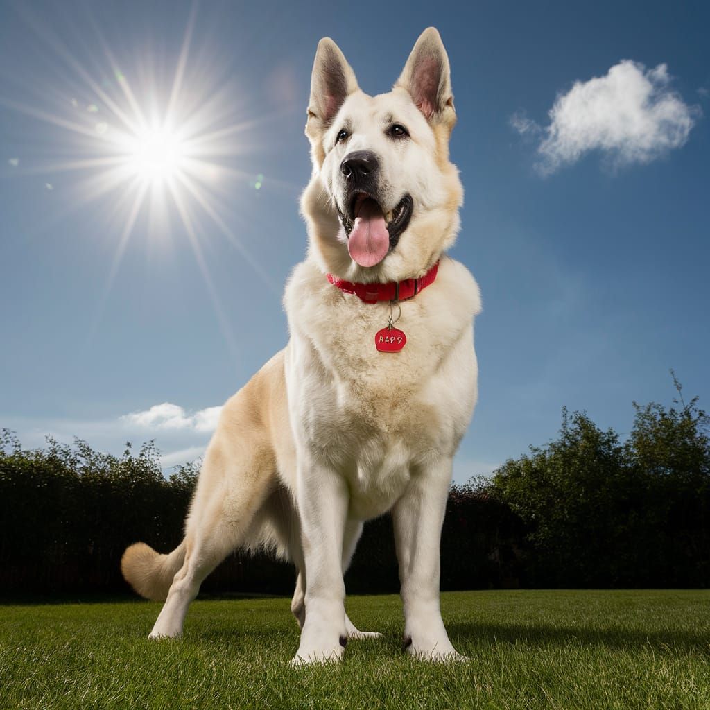 This image shows a large, bright white German Shepherd standing on a green lawn. The dog has a red collar with a silver tag that says "HAPPY". Sunlight and white clouds enhance the scene.