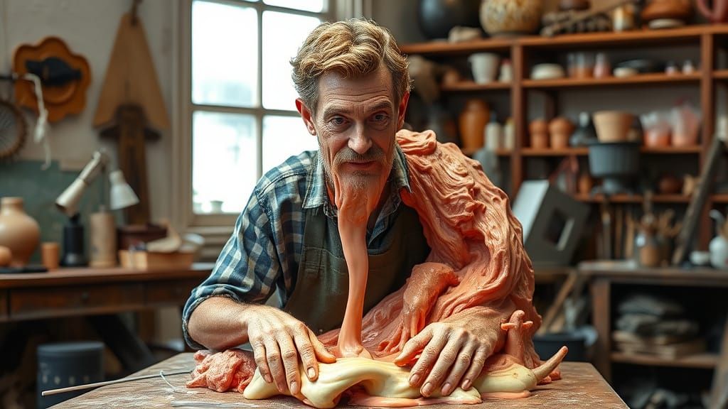 This image shows a surreal melting wax sculpture in a sculptor's studio. The artwork combines diverse materials and showcases meticulous detail, embodying a sense of whimsical artistry.