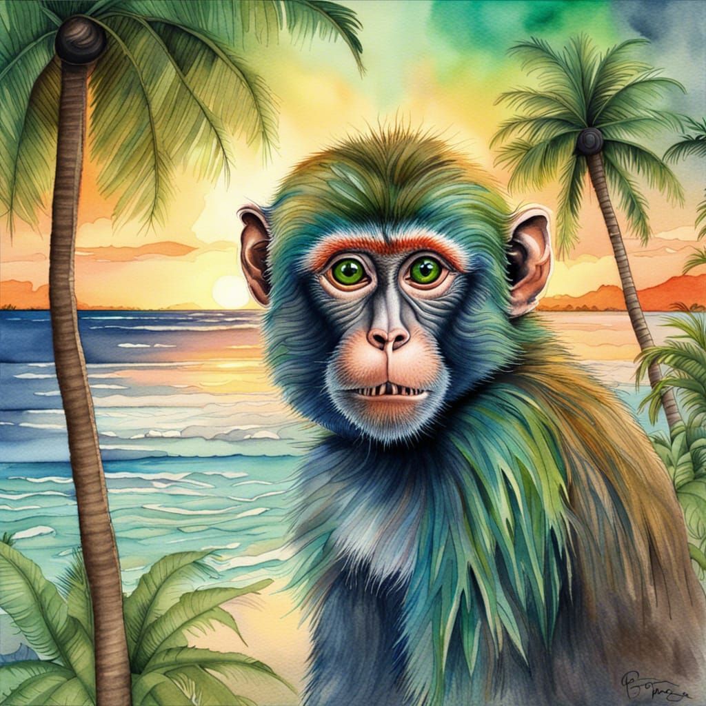 This image shows a watercolor painting of a Fijian monkey with vibrant green and blue fur, set against a picturesque beach sunset with palm trees. The artwork features deep colors and intricate details.