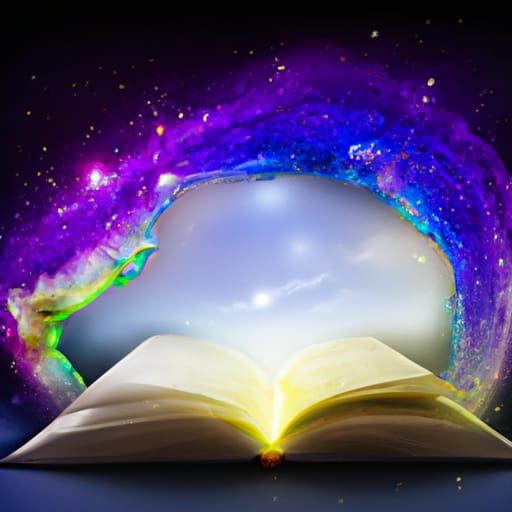 A striking picture of a cosmic book with galaxy pages at the center of the universe. This hyperdetailed, radiant image captures a dreamlike aetherpunk aesthetic with swirling stars and auroras.