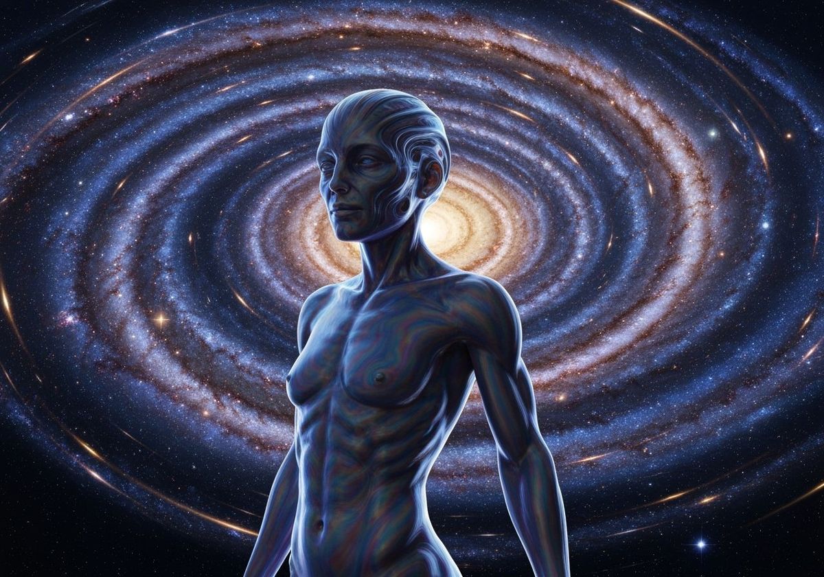 A striking picture of an ethereal energy being with skin like polished obsidian. Swirling cosmic galaxies form the backdrop, illuminated with a soft glow in a neo-noir aesthetic.