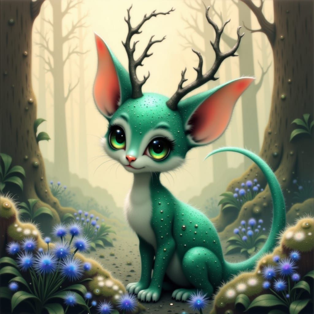 A majestic dragon-cat hybrid with jade scales sits among blue aster flowers in a winter forest. The creature, adorned with antlers, is bathed in warm light, rendered with meticulous textures and a whimsical aesthetic.