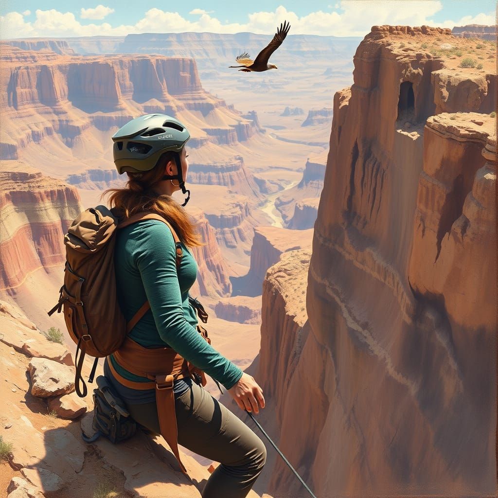 This image shows a woman rock climbing in the Grand Canyon. The vast desert landscape features rugged red rock formations. An eagle flies above her in this detailed landscape painting.