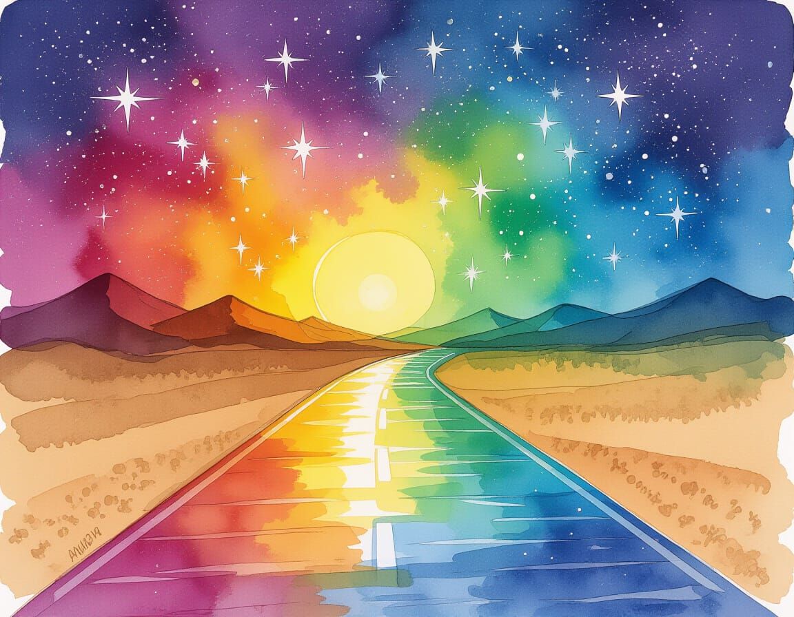 This image showcases a vibrant, wet-on-wet watercolor painting depicting a path of stars leading to infinity, with sand and the song of time. Details are enhanced with alcohol ink techniques.