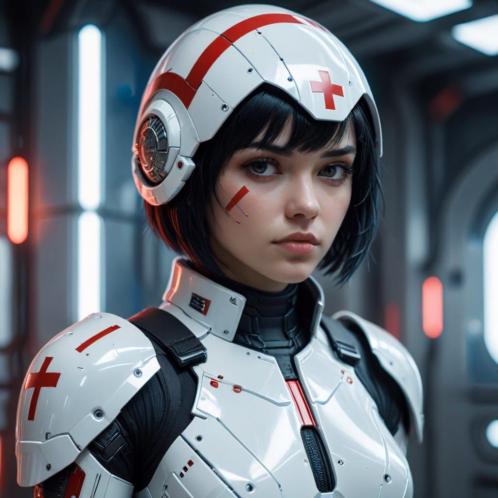 This image shows a futuristic soldier in white armor with red crosses, set in a high-tech cyberpunk environment. The digital art features metallic textures, soft lighting and a blue and white color palette.