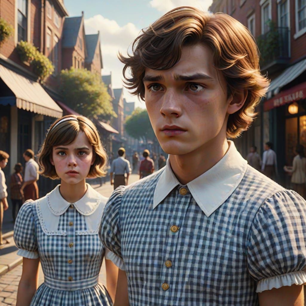 This cinematic digital painting depicts a young man standing in the street, fully crossdressed in a vibrant gingham dress, exuding worry and concern, set against a richly detailed backdrop with intricate patterns and warm, golden lighting.