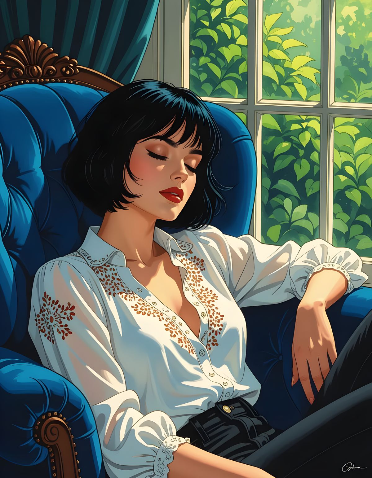 This image shows a woman sleeping in a chair by a window overlooking a garden. The art is a cinematic, comic book style portrait.