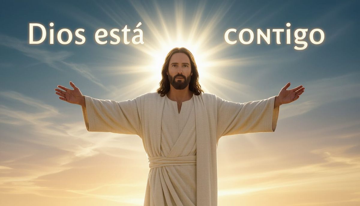 This image shows Jesus with open arms, conveying love and security, with bright light emanating from behind. The cinematic image evokes a dramatic and textural 35mm film style.