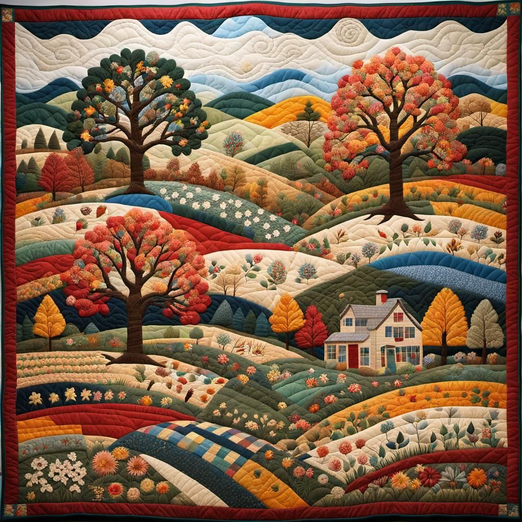This image shows a charming traditional quilt featuring a tree representing the four seasons, rendered in the style of a 19th-century American folk art patchwork with intricate details and vibrant colors.