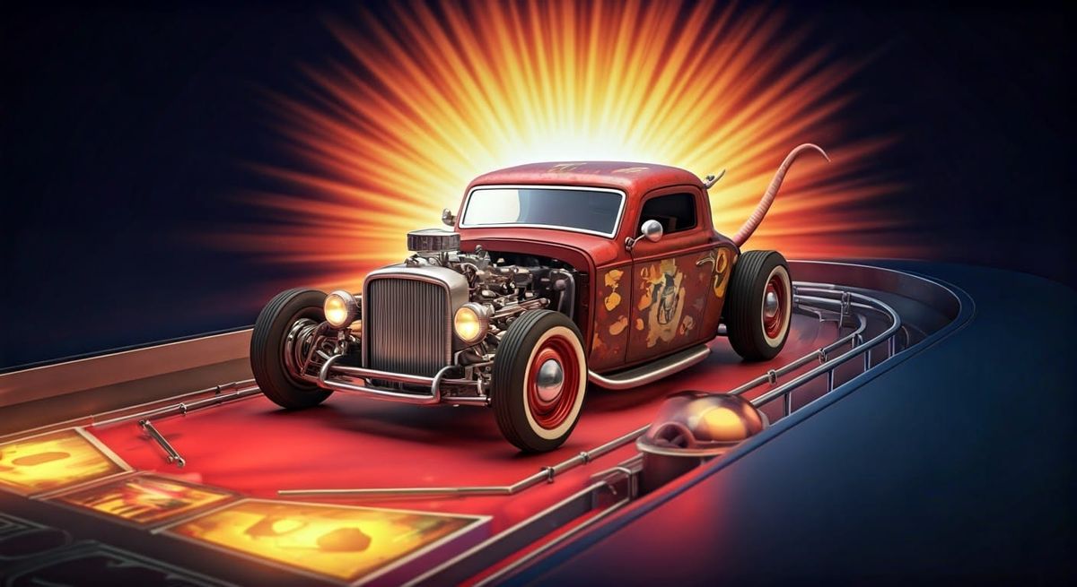 This vibrant image shows a rat rod speeding through a massive pinball machine, set against a bright, radial gradient background, showcasing the artist's use of 3D digital art and advanced shading techniques.