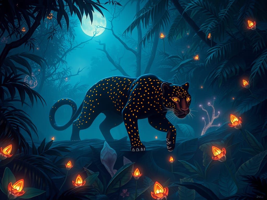 This image shows a black panther with gold markings walking in a bioluminescent jungle filled with glowing plants. The artwork is rendered in a hyperrealistic style, with vibrant colors and ornate details.