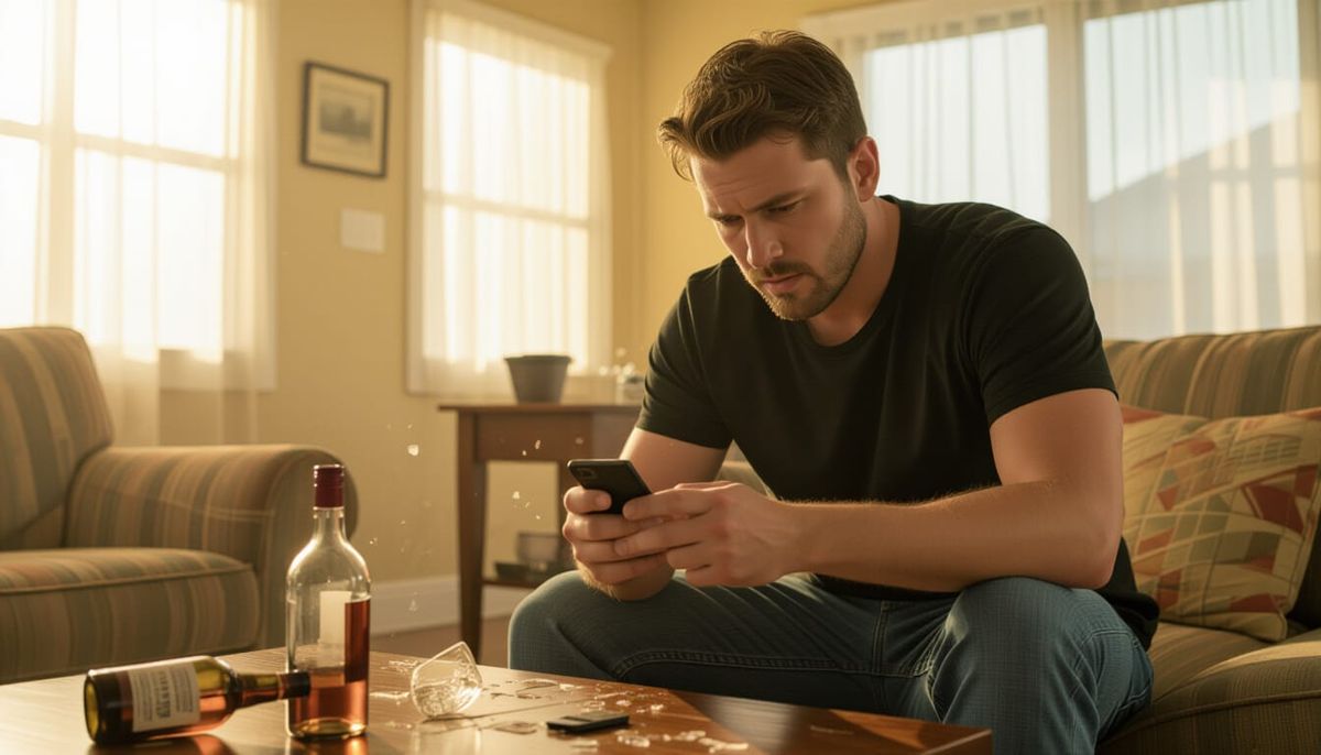 This image shows a distressed man in jeans and a t-shirt destroying a liquor bottle while deleting contacts on his phone. Warm cinematic lighting and a muted color palette enhance the dramatic scene, in a gritty, cinematic style.