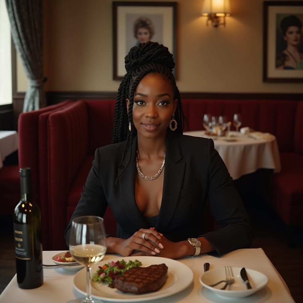 This realistic image features a 50-year-old African American woman with braided hair, dressed in a business suit, seated in a high-class restaurant. A steak dinner and wine are on the table, with vintage photos adorning the walls.