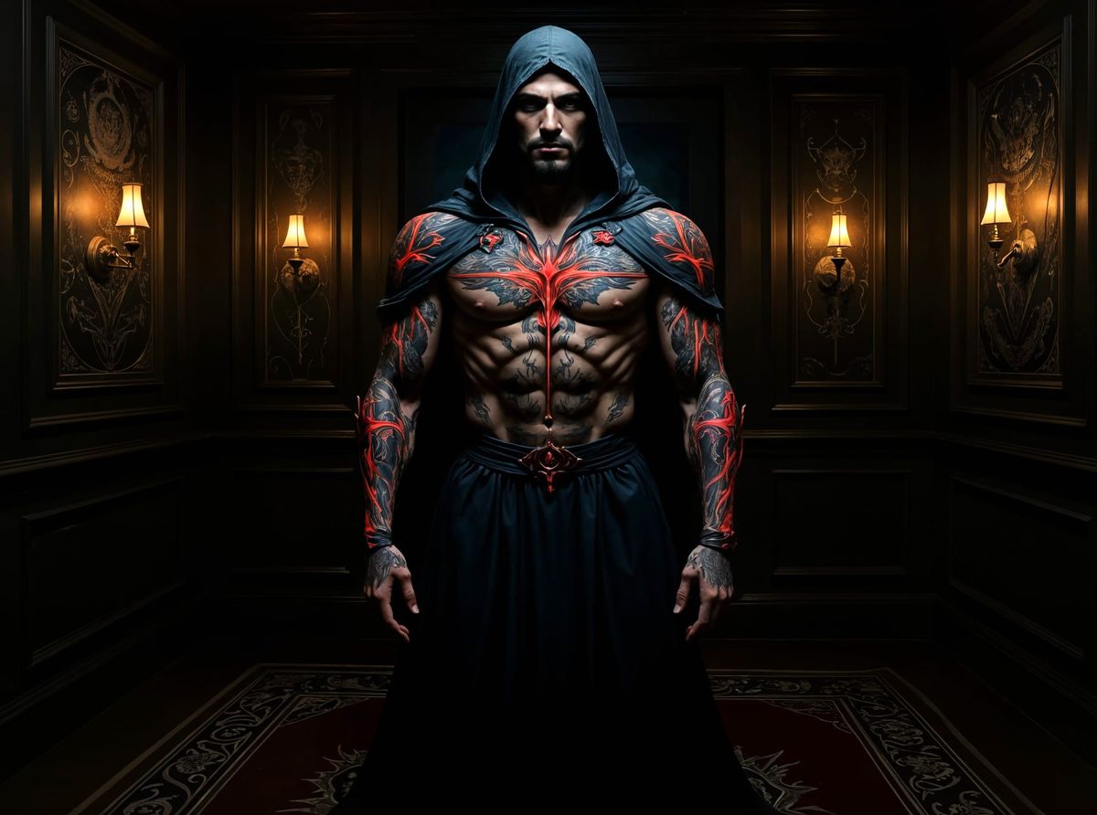 This image shows a full body tattoo design, as if created in an occult tattoo shop. The design is intricate and covers the entire body, showcasing dark artistry.