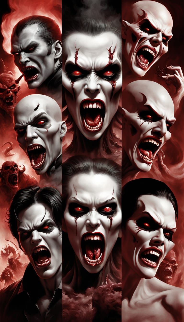 A horror collage featuring demonic figures morphing from sepia and crimson smoke, with hollowed mouths against vanta black. Detailed, morbid, and razor-sharp.
