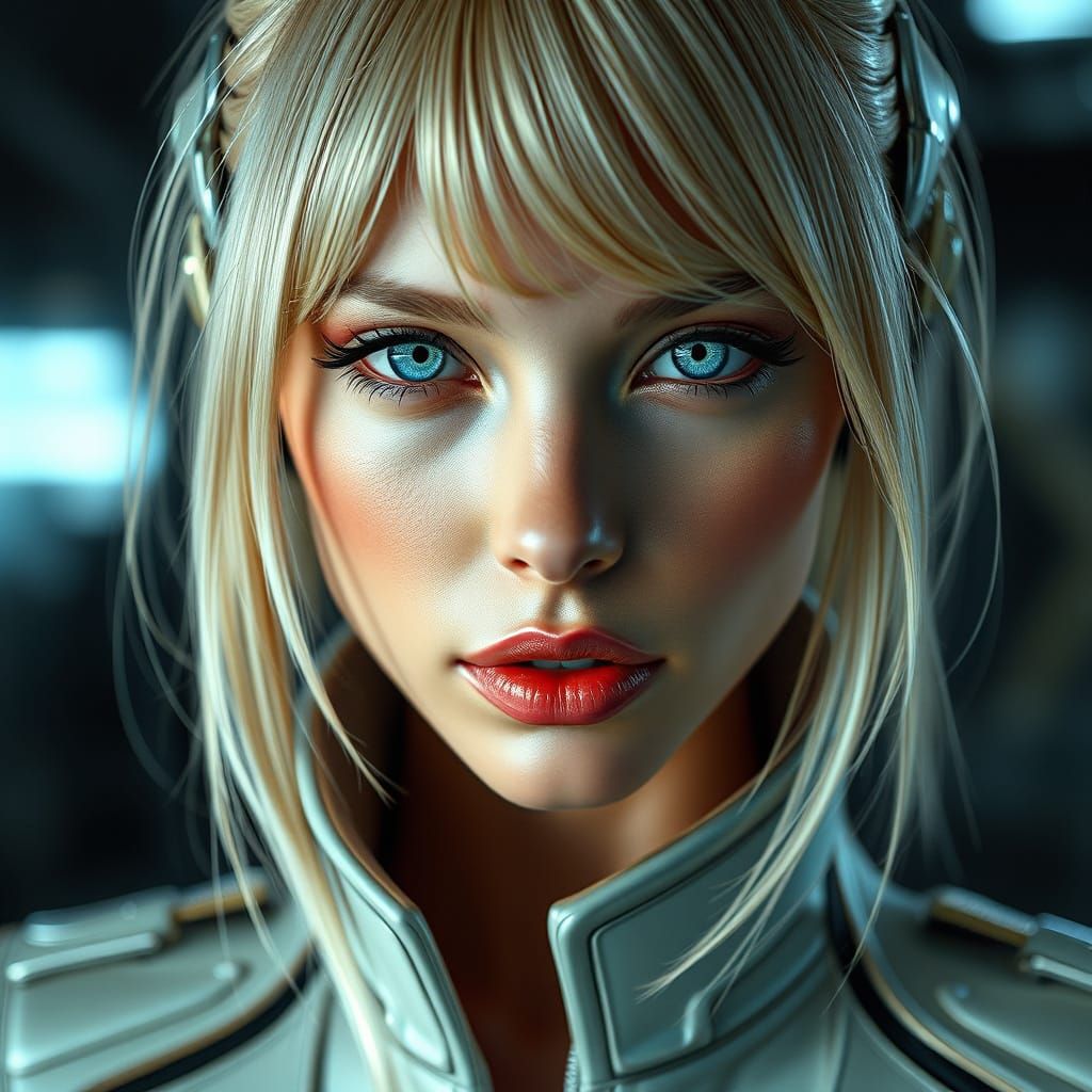 This image shows a hyper-realistic portrait of a blonde cyborg woman with piercing blue eyes. She is depicted in a futuristic aesthetic, with metallic accents and neon undertones.